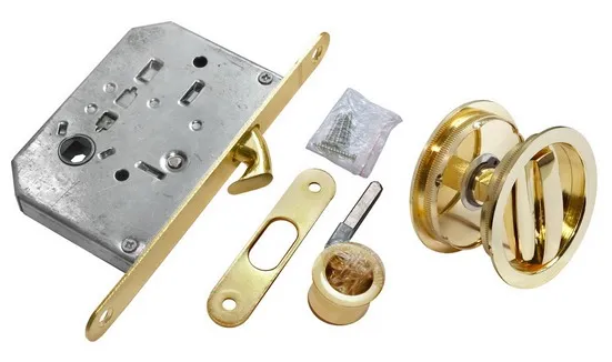 Комплект ручек для раздвижных дверей с механизмом, позволяющим запереть дверь с помощью завертки, или фиксатора.