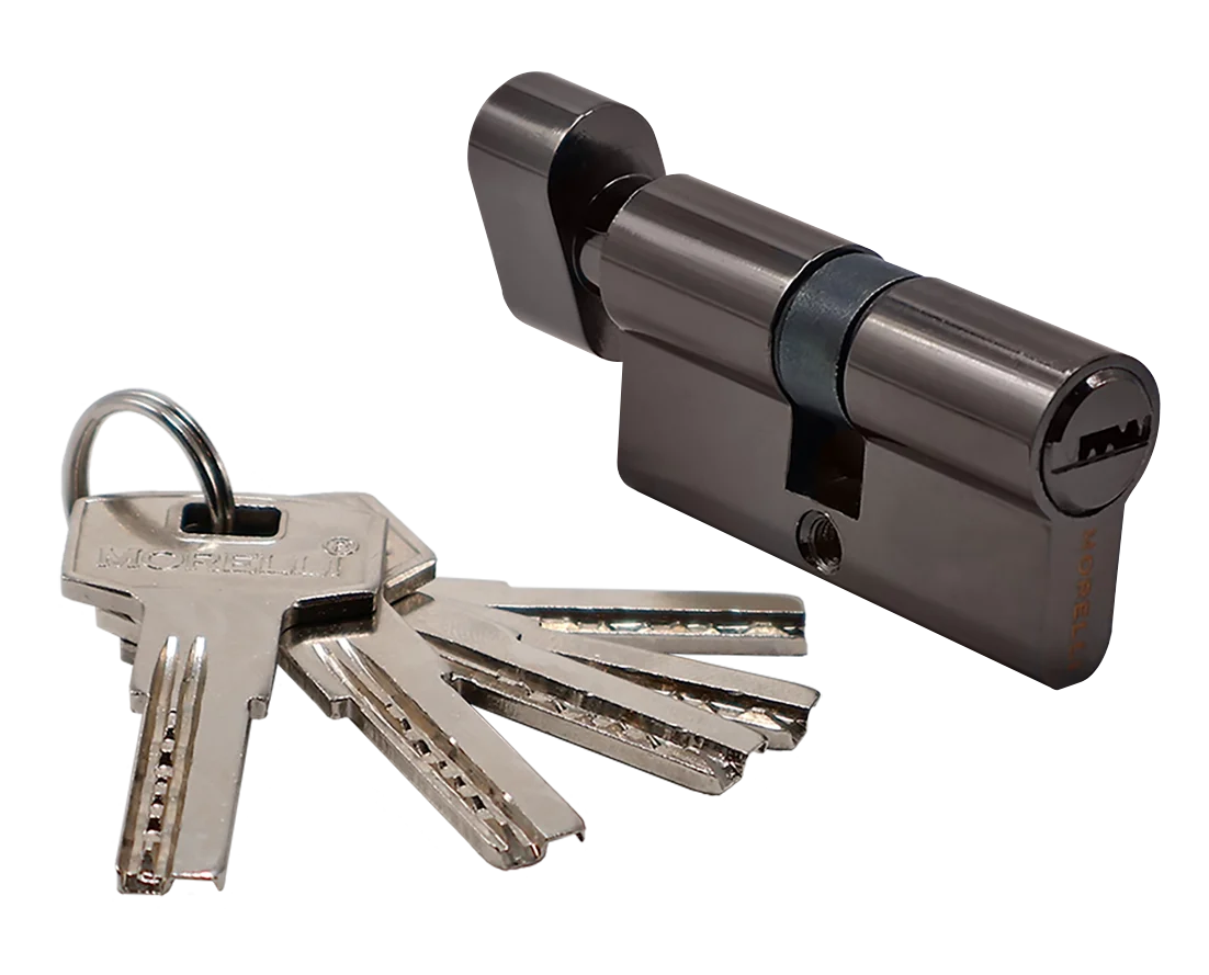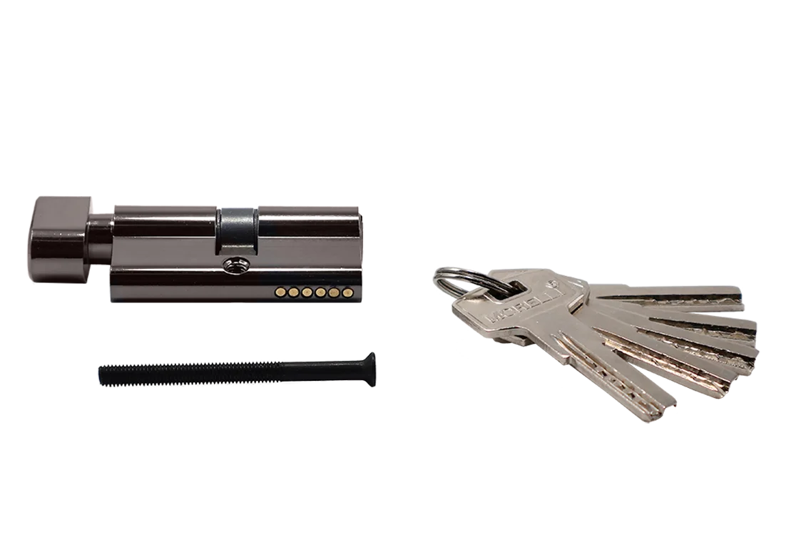 Ключевой цилиндр повышенной секретности для двери вставляется в замок или защелку для закрытия ключом с одной стороны помещения и поворота кноба с другой, дополняя общую конструкцию.