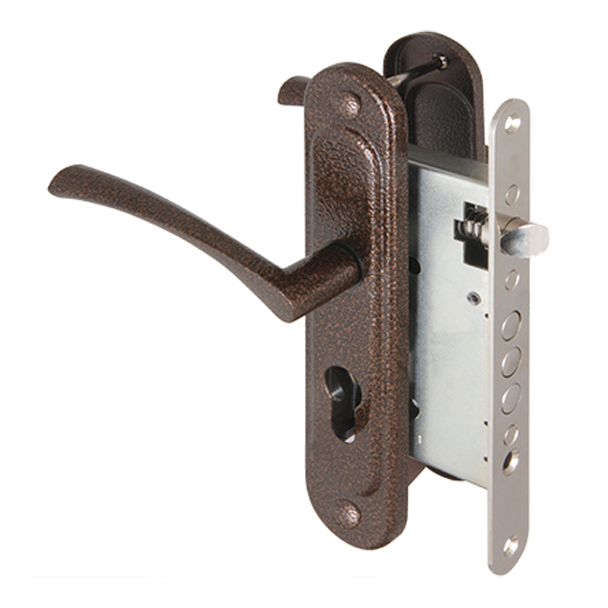 Корпус врезного замка с защелкой и фалевыми ручками на планке  KIT А5-3155/3 W/B предназначен для установки на двери общественных и жилых помещений. Может монтироваться на левых и правых дверях, открывающихся наружу и во внутрь. Межосевое расстояние 55 мм. Бэксет 55 мм. Засов состоит из 3-х стальных ригелей диаметром 10,8мм. В фалевые ручки на планке добавлены пружины и фиксаторы, что исключает "провисание" и обеспечивает четкую фиксацию их положения. Ручки изготовлены из алюминиевого сплава, а накладки из стали и покрыты полимерной краской, цвет: медный антик. Цилиндр и ответная планка в комплект не входят. Комплектация : корпус замка, ручки на планке, квадрат под ручки (8х100мм), стяжные винты, винт для цилиндра, паспорт изделия.