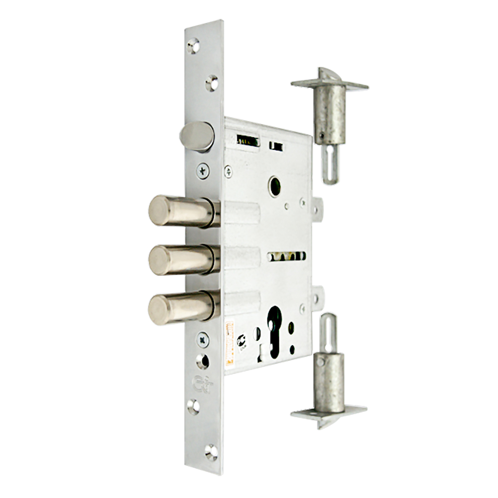 Корпус замка ЗВ-7РМП-006-Хп предназначен для установки в противопожарные двери. Корпус замка снабжен засовом, состоящим из 3-х ригелей диаметром 16,8 мм, защелкой, переворачиваемой под любое исполнение и двумя дополнительными защелками. Дополнительные защелки устанавливаются в верхнем и нижнем углах двери в целях предотвращения температурной деформации дверного полотна и, как следствие, проникновения огня. Защелки через тяги соединяются с ригелями, которые сходятся при повороте ручки. Все детали стальные. Замки сертифицированы по 4-му классу при использовании стандартного цилиндрового механизма секретности "KALE" с ключами "перфокарта" и броненакладкой. Вылет засова 36 мм при 3-х полных оборотах ключа. Угол поворота ручки привода защелок через шток квадратного сечения 8x8 мм составляет 32 градуса. Цвет: полировочный хром.