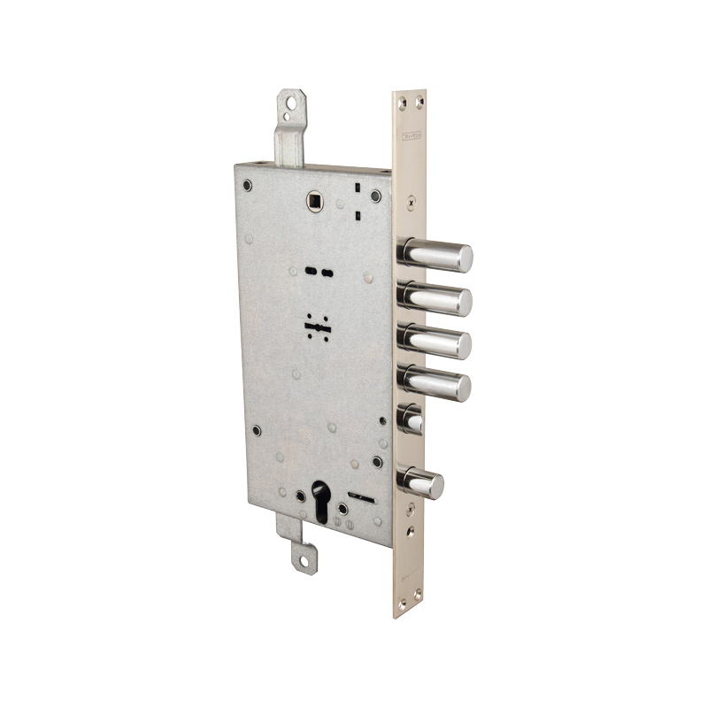 Замок врезной двухсистемный Mottura 54.787 предназначен для металлических и бронированных дверей. Основной сувальдный замок + вспомогательный цилиндровый замок. Реверсивной защелке, подходит для левых и правых дверей. Верхний сувальдный 4 оборотный замок с тремя точками запирания с защелкой диаметром 20 мм, приводимой в действие ключом, фалевой ручкой и цилиндровым механизмом. Круглые ригели диаметром 18 мм с ходом 40 мм для сувальдного замка. Нижний замок 2 оборотный под европейский цилиндр с круглыми ригелями диаметром 18 мм с ходом 22 мм. Бэксет: 63 мм. Ход тяг 20 мм.