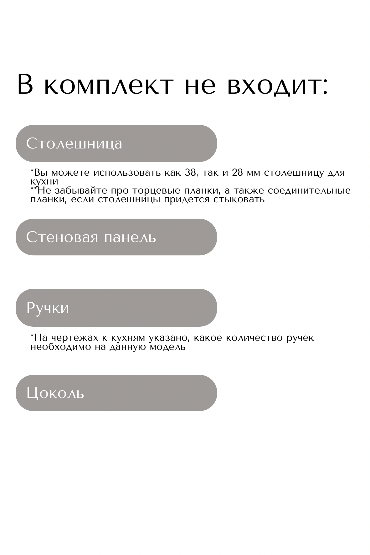 Дополнительно приобретается: пластиковый цоколь, высота подбирается в зависимости от выстроенной высоты ножек от 100 до 150 мм, столешница (предусмотрена толщина как 28 мм, так и 38 мм), техника, мойка, ручки (могут быть использованы как торцевые, так и фасадные).