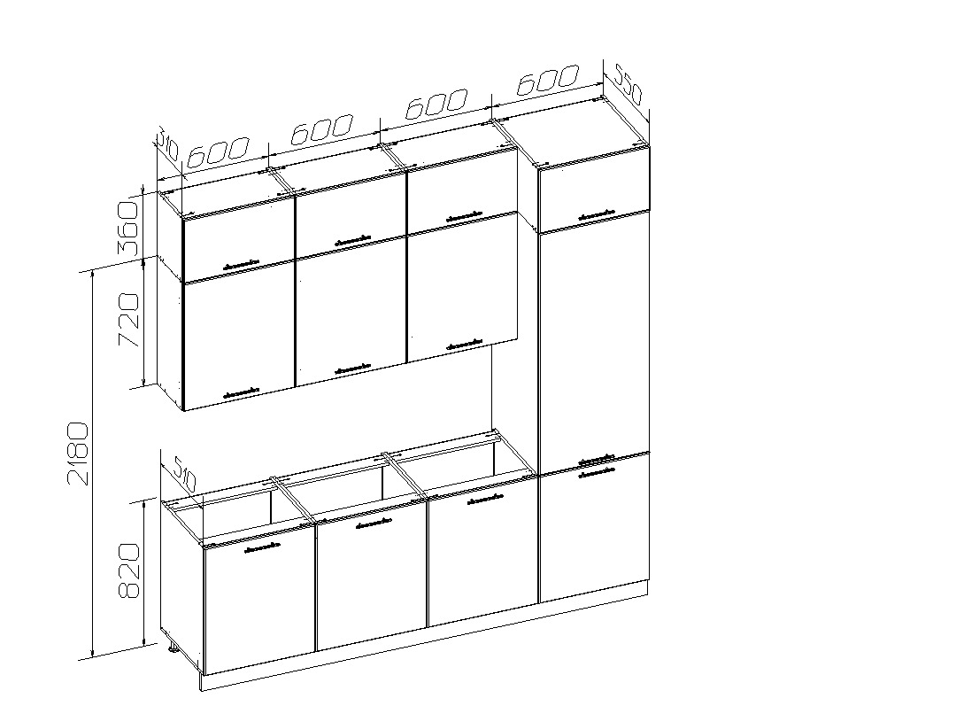 В комплект входит: верхние, нижние модуля (корпус и фасады), все крепления, ножки-опоры регулируемые от 100 до 150 мм.
