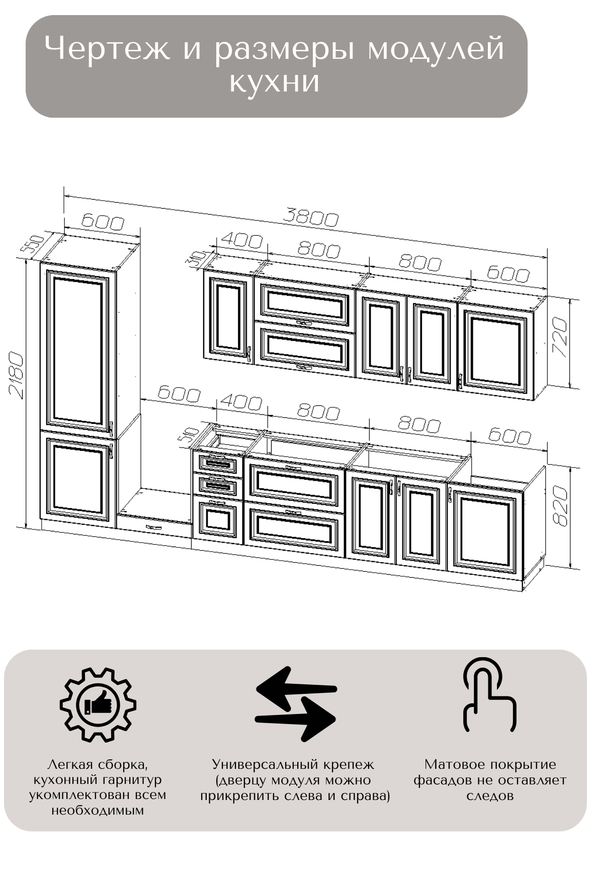 В комплект входит: верхние, нижние модуля (корпус и фасады), все крепления, ножки-опоры регулируемые от 100 до 150 мм.