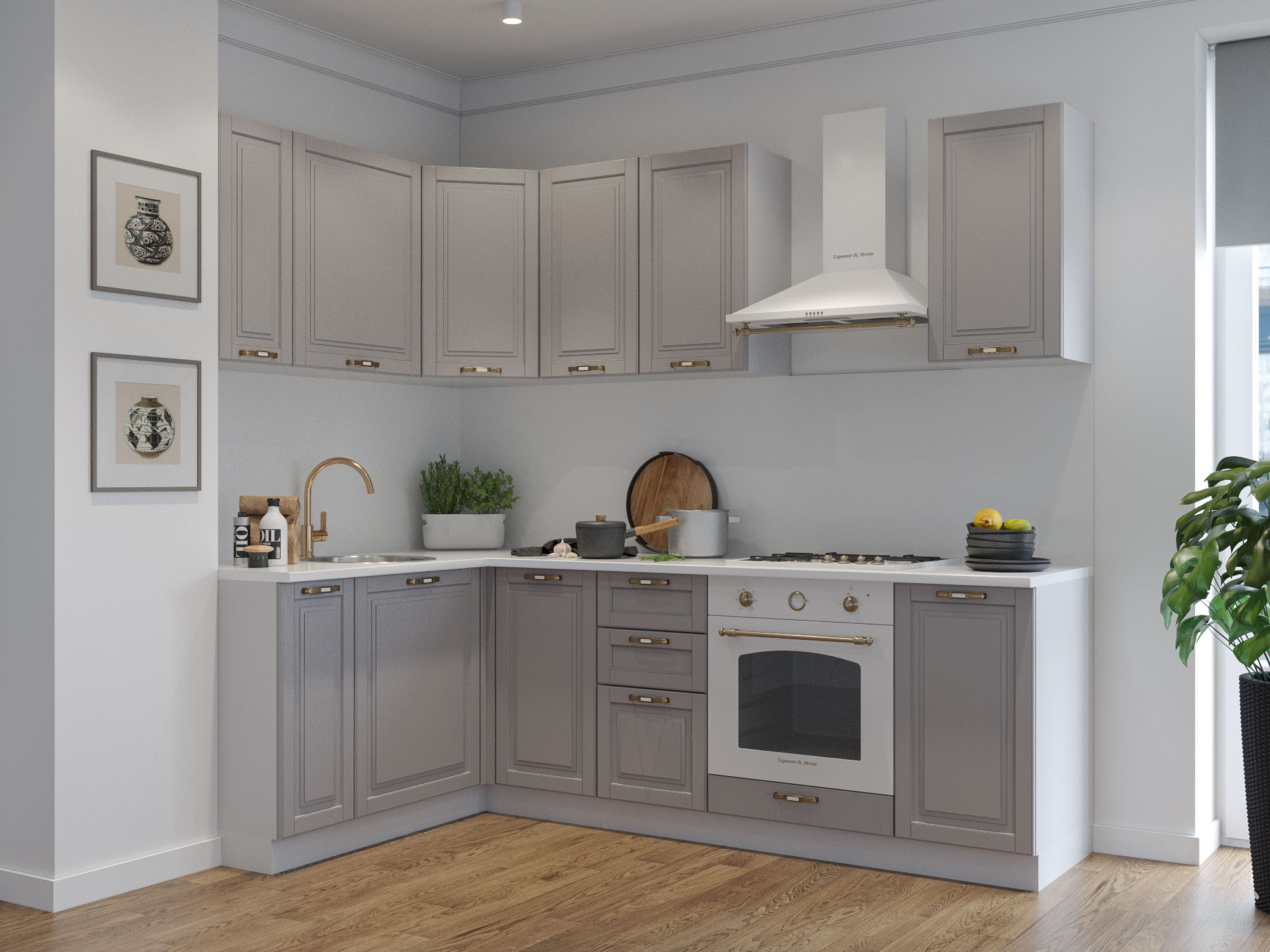 Дополнительно приобретается: пластиковый цоколь, высота подбирается в зависимости от выстроенной высоты ножек от 100 до 150 мм, столешница (предусмотрена толщина как 28 мм, так и 38 мм), техника, мойка, ручки (могут быть использованы как торцевые, так и фасадные).