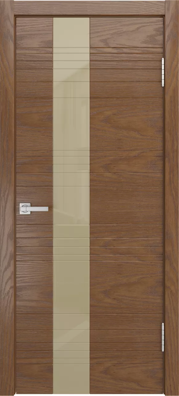 Дверь ID-HL ДО имеет каркасно-щитовую конструкцию с фрезерованной поверхностью полотна. Модель остеклена лакобелем и покрыта натуральным шпоном ясеня или дуба на выбор.