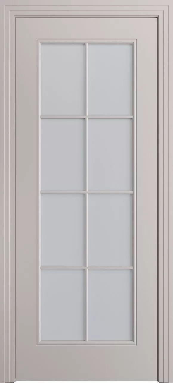 Дверь Версаль-Ф Loft (8) ДО имеет каркасно-щитовую конструкцию с фрезерованной поверхностью полотна и английской решеткой на 8 квадратов. Модель остеклена светлым или темным сатинатом на выбор и покрыта эмалью.