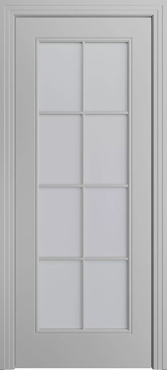 Дверь Версаль-Ф Loft (8) ДО имеет каркасно-щитовую конструкцию с фрезерованной поверхностью полотна и английской решеткой на 8 квадратов. Модель остеклена светлым или темным сатинатом на выбор и покрыта эмалью.