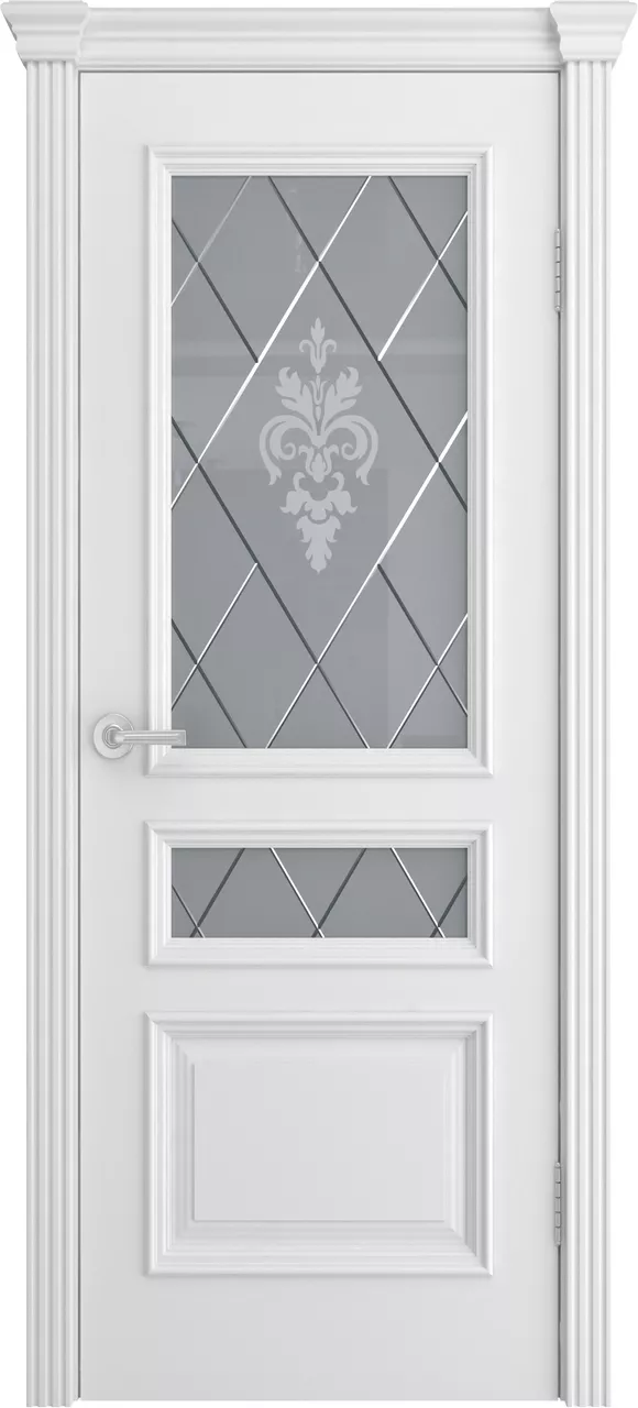 Дверь Версаль-2 ДО имеет сборную конструкцию с фрезерованной поверхностью полотна, имитирующей филенки, и накладным багетом. Модель покрыта эмалью и остеклена на выбор стеклом с пескоструйным рисунком, матированным стеклом с золотым рисунком, матированным стеклом с гравировкой или наливным витражом.