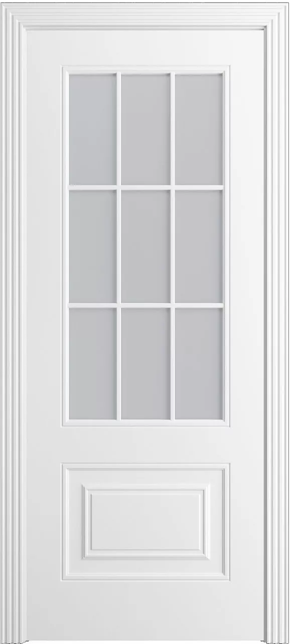 Дверь Версаль-Ф Loft (9) ДО имеет каркасно-щитовую конструкцию с фрезерованной поверхностью полотна и английской решеткой на 9 квадратов. Модель остеклена светлым или темным сатинатом на выбор и покрыта эмалью.