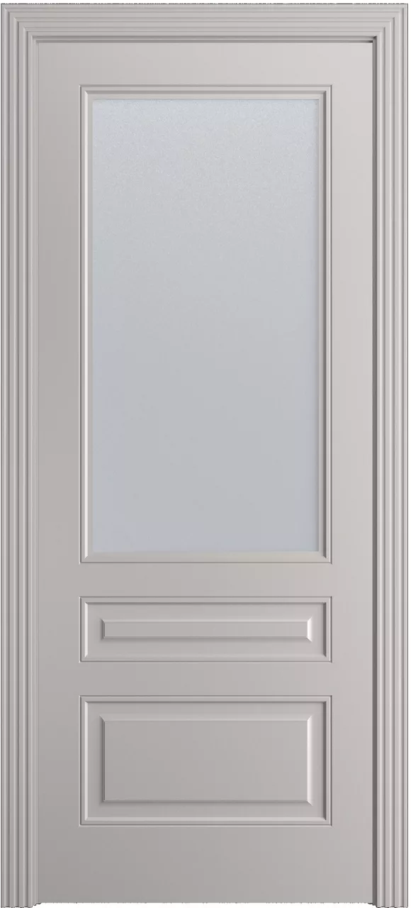Дверь Бьянка-3 ДО имеет каркасно-щитовую конструкцию с фрезерованной поверхностью полотна, имитирующей филенки. Модель остеклена на выбор светлым сатинатом, фигурным литьем, гравированным или зеркальным стеклом и покрыта эмалью.