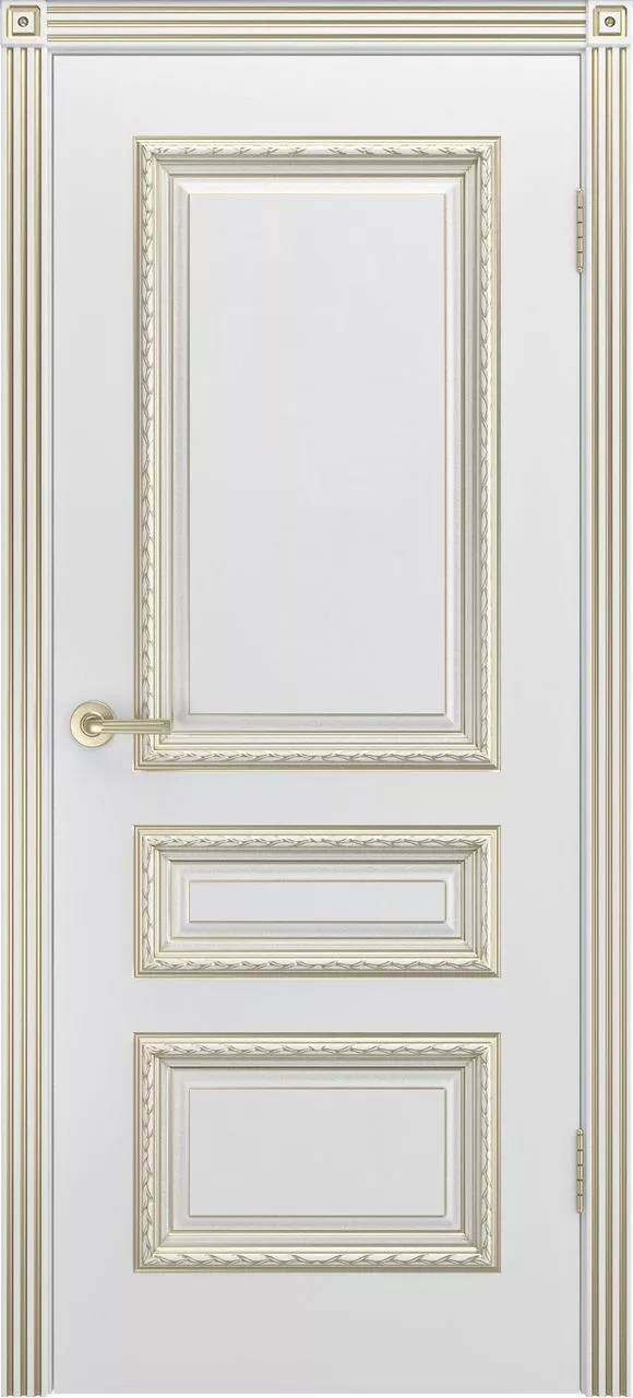 Дверь Трио R В1 ДГ имеет каркасно-щитовую конструкцию с фрезерованной поверхностью полотна, имитирующей филенки, и цельным багетом с узором «косичка». Фигурная фрезеровка на «филенках» отсутствует. Модель покрыта эмалью.
