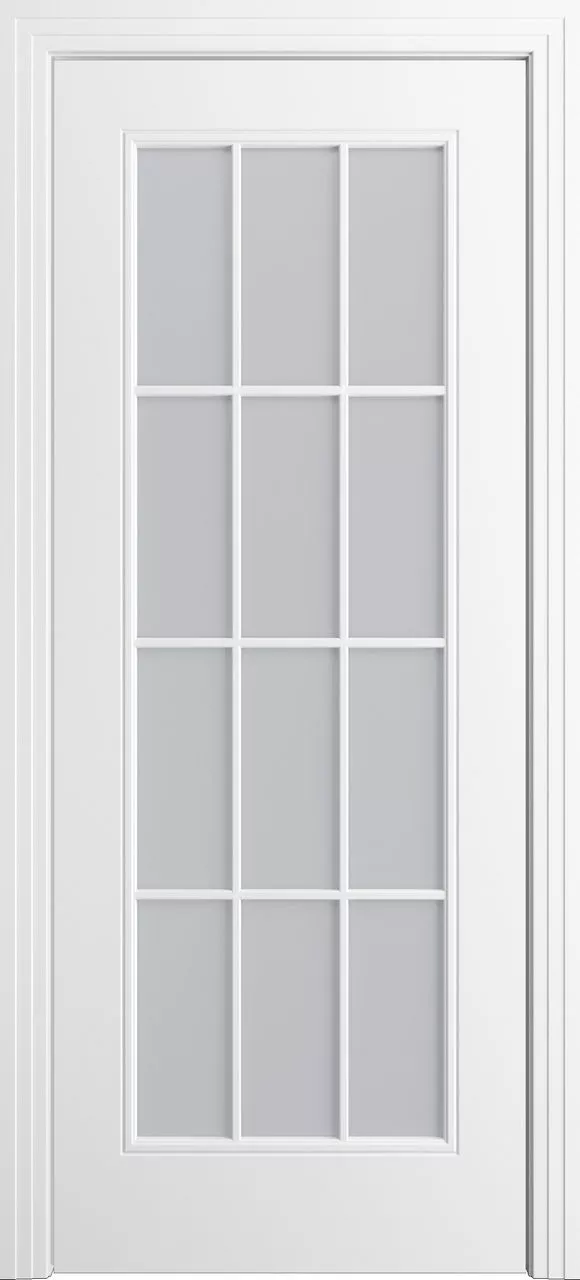 Дверь Версаль-Ф Loft (12) ДО имеет каркасно-щитовую конструкцию с фрезерованной поверхностью полотна и английской решеткой на 12 квадратов. Модель остеклена светлым или темным сатинатом на выбор и покрыта эмалью.