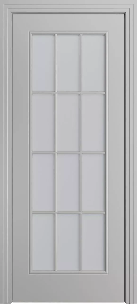 Дверь Версаль-Ф Loft (12) ДО имеет каркасно-щитовую конструкцию с фрезерованной поверхностью полотна и английской решеткой на 12 квадратов. Модель остеклена светлым или темным сатинатом на выбор и покрыта эмалью.
