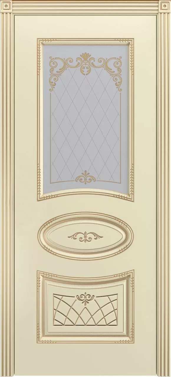 Дверь Ария В3 ДО имеет каркасно-щитовую конструкцию с фрезерованной поверхностью полотна, имитирующей филенки. Также имеется фигурная фрезеровка на «филенках» и вензель между ними. Остекление на выбор сатинированное или с фотопечатью. Модель покрыта эмалью.