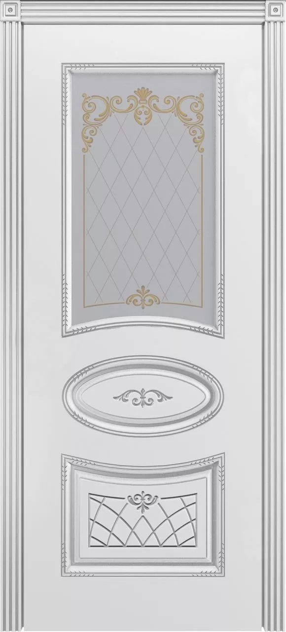 Дверь Ария В3 ДО имеет каркасно-щитовую конструкцию с фрезерованной поверхностью полотна, имитирующей филенки. Также имеется фигурная фрезеровка на «филенках» и вензель между ними. Остекление на выбор сатинированное или с фотопечатью. Модель покрыта эмалью.