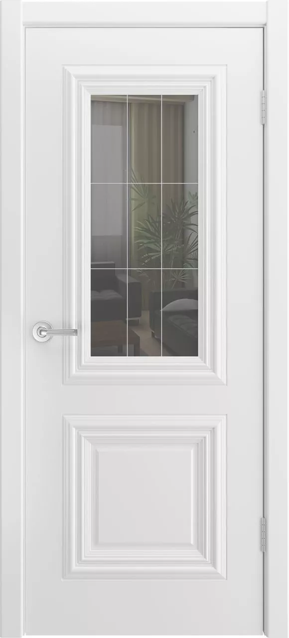 Дверь Канто-1 ДО имеет каркасно-щитовую конструкцию с фрезерованной поверхностью полотна, имитирующей филенки, и цельным багетом. Модель покрыта эмалью и остеклена рефлективом либо сатинатом. Также на выбор можно нанести фотопечать либо графировку на стекло.