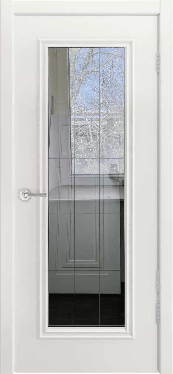 Дверь Турин-1 ДО имеет каркасно-щитовую конструкцию с фрезерованной поверхностью полотна, имитирующей филенки, и цельным багетом. Модель покрыта эмалью и остеклена рефлективом либо сатинатом. Также на выбор можно нанести фотопечать либо графировку на стекло.