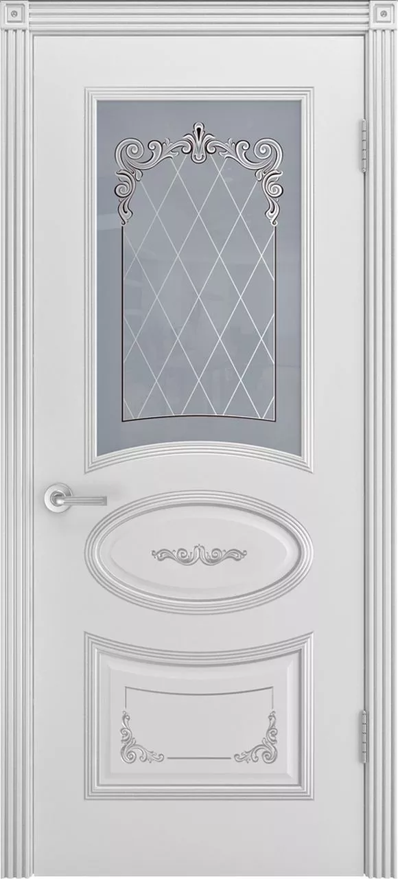 Дверь Ария Грейс-2 В3 ДО имеет каркасно-щитовую конструкцию с фрезерованной в 3 канавки поверхностью полотна, имитирующей филенки. Также имеется фигурная фрезеровка на «филенках». Остекление на выбор сатинированное или с фотопечатью. Модель покрыта эмалью.