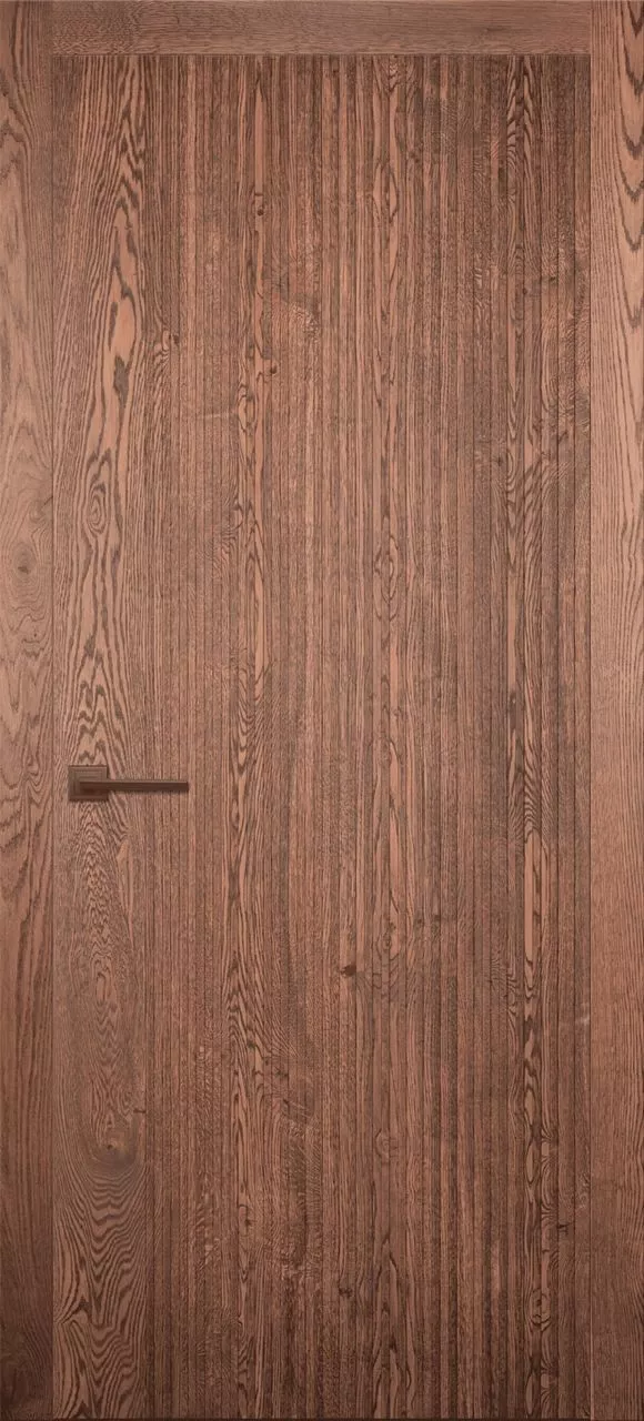 Дверь Легно-2 ДГ имеет каркасно-щитовую конструкцию с фрезерованной поверхностью полотна. Модель изготовлена по технологии DSW из внутренней рамки с цельным заполнением массивом и оклеена дубовыми щитами из нерошенной рустикальной ламели дуба. Покрыта морилкой и водным лаком.
