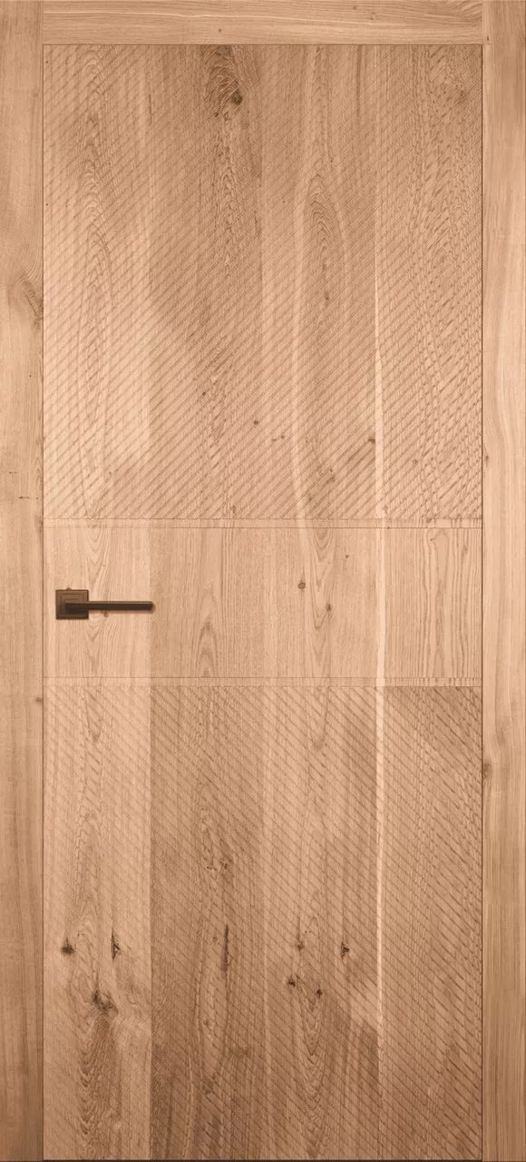 Дверь Легно-11 ДГ имеет каркасно-щитовую конструкцию с фрезерованной поверхностью полотна. Модель изготовлена по технологии DSW из внутренней рамки с цельным заполнением массивом и оклеена дубовыми щитами из нерошенной рустикальной ламели дуба. Покрыта морилкой и водным лаком.