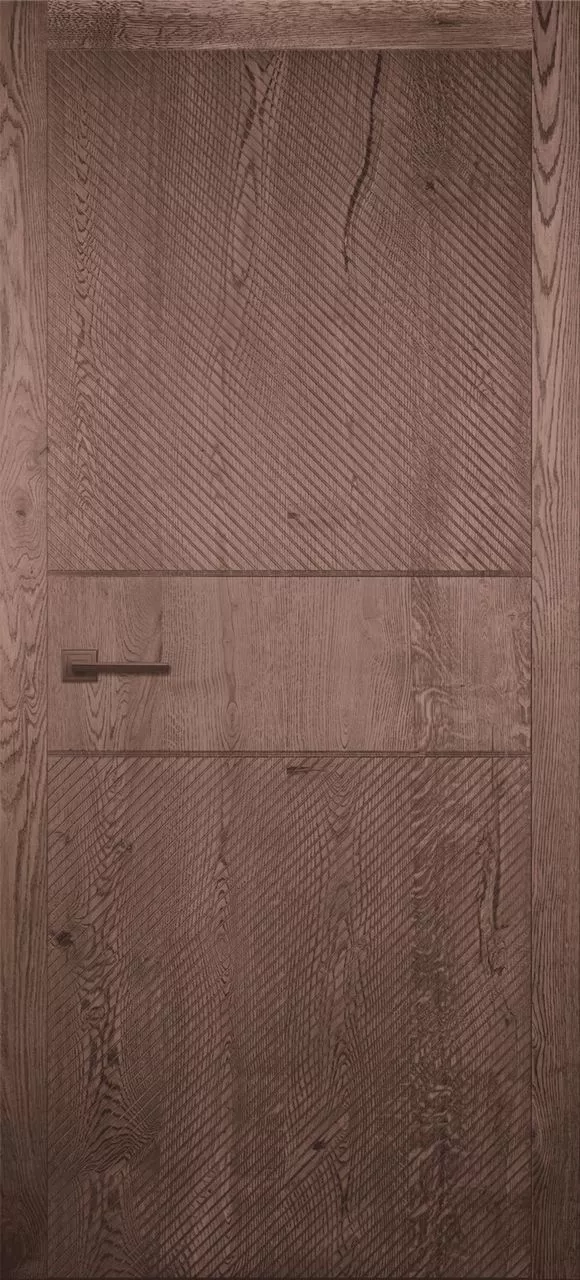 Дверь Легно-11 ДГ имеет каркасно-щитовую конструкцию с фрезерованной поверхностью полотна. Модель изготовлена по технологии DSW из внутренней рамки с цельным заполнением массивом и оклеена дубовыми щитами из нерошенной рустикальной ламели дуба. Покрыта морилкой и водным лаком.