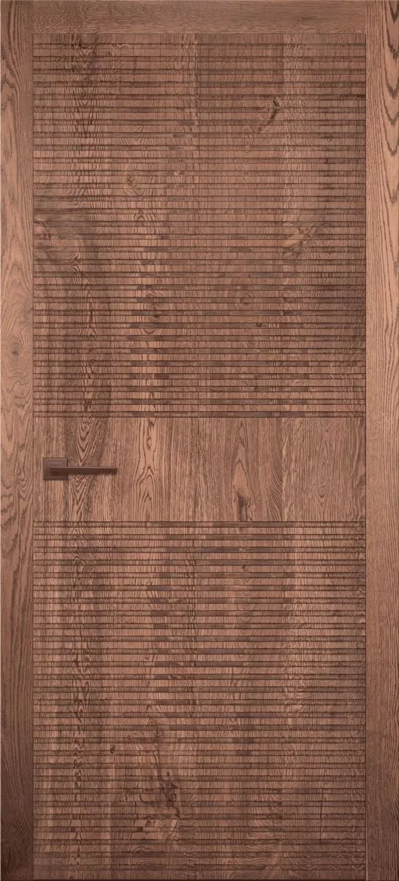 Дверь Легно-9 ДГ имеет каркасно-щитовую конструкцию с фрезерованной поверхностью полотна. Модель изготовлена по технологии DSW из внутренней рамки с цельным заполнением массивом и оклеена дубовыми щитами из нерошенной рустикальной ламели дуба. Покрыта морилкой и водным лаком.