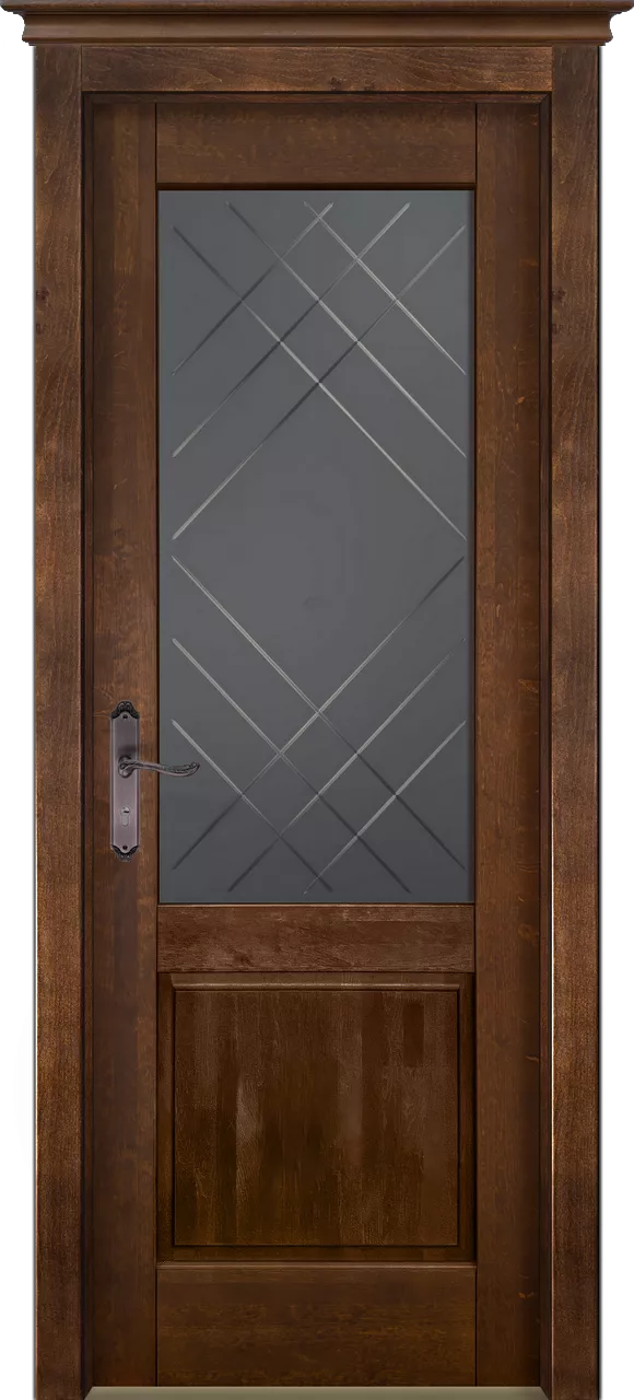 Дверь М5 ДО имеет сборную царговую конструкцию с фрезерованной поверхностью полотна. Остекление мателюксом в цвете Графит с гравировкой. Модель изготовлена из массива ольхи, на выбор покрыта тонировкой (бейц) или эмалью.