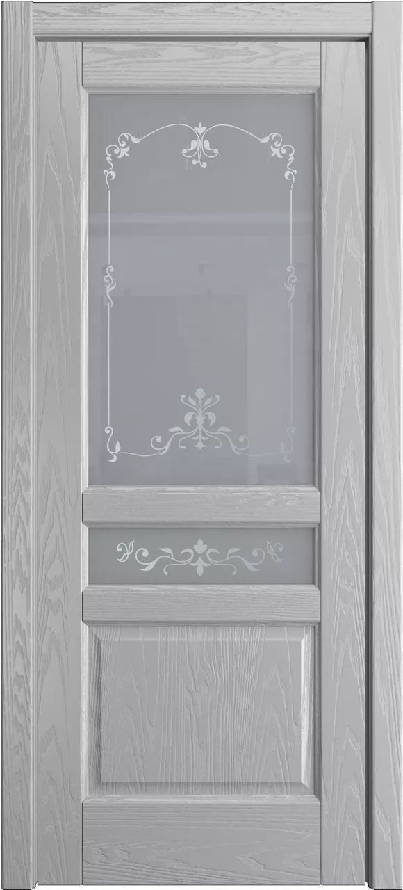 Дверь Ребекка ДО имеет сборную конструкцию с фрезерованными филенками. Модель остеклена светлым или матовым стеклом с золотой фотопечатью или пескоструйным рисунком и покрыта натуральным шпоном ясеня или дуба на выбор.