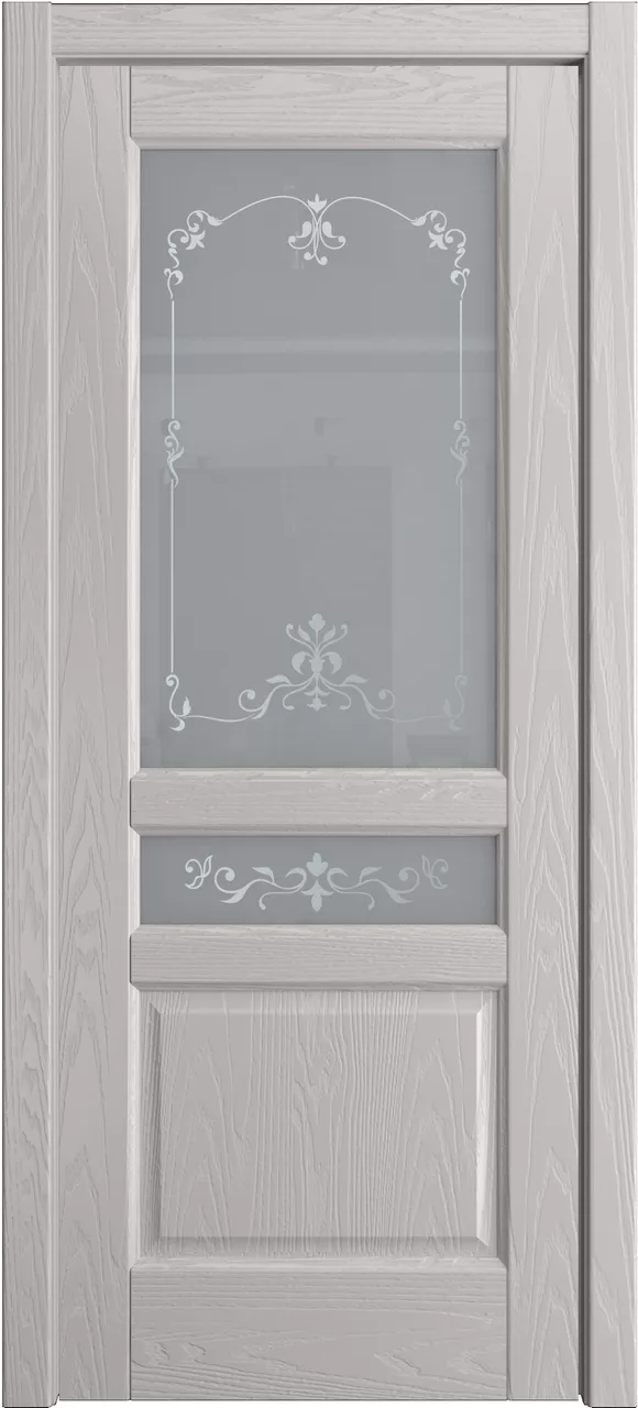 Дверь Ребекка ДО имеет сборную конструкцию с фрезерованными филенками. Модель остеклена светлым или матовым стеклом с золотой фотопечатью или пескоструйным рисунком и покрыта натуральным шпоном ясеня или дуба на выбор.