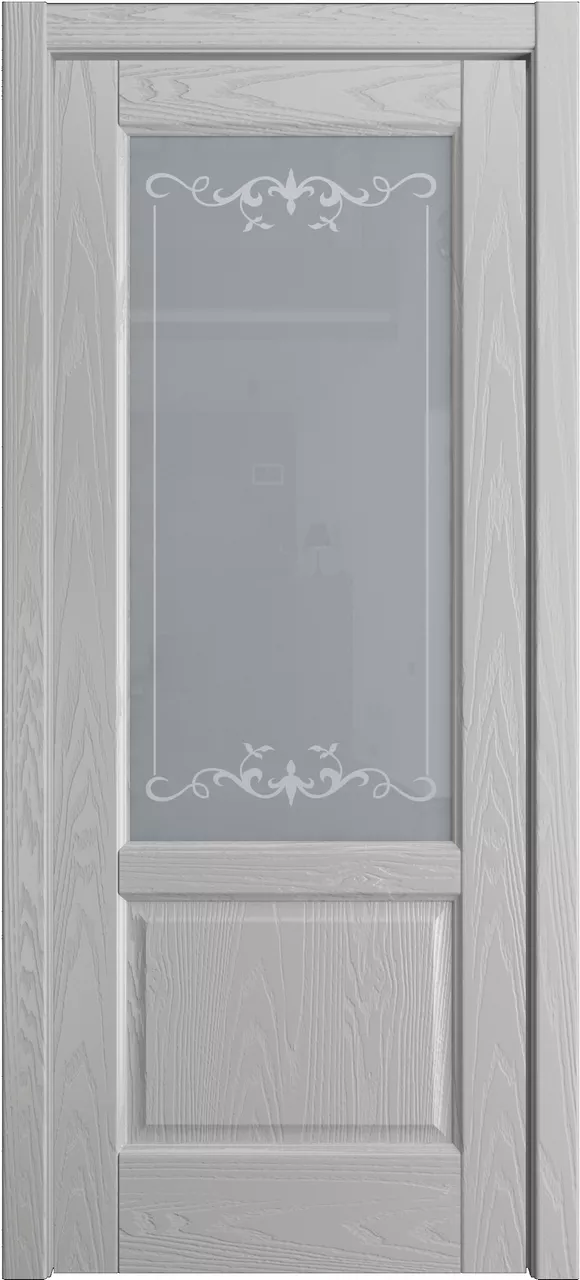 Дверь Ровена ДО имеет сборную конструкцию с фрезерованными филенками. Модель остеклена светлым или матовым стеклом с золотой фотопечатью или пескоструйным рисунком и покрыта натуральным шпоном ясеня или дуба на выбор.