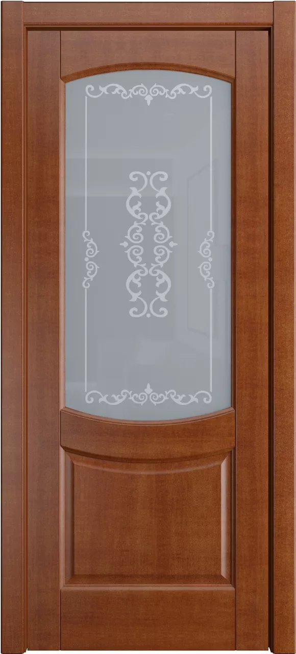 Дверь Эрнеста ДО имеет сборную конструкцию с фрезерованными филенками. Модель остеклена светлым или матовым стеклом с золотой фотопечатью или пескоструйным рисунком и покрыта натуральным шпоном ясеня или дуба на выбор.