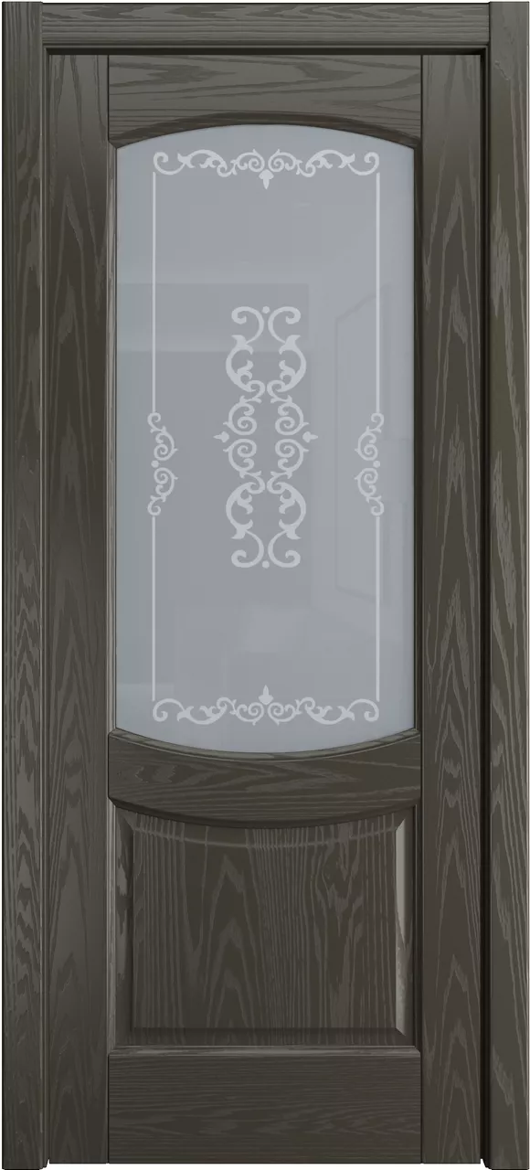 Дверь Эрнеста ДО имеет сборную конструкцию с фрезерованными филенками. Модель остеклена светлым или матовым стеклом с золотой фотопечатью или пескоструйным рисунком и покрыта натуральным шпоном ясеня или дуба на выбор.