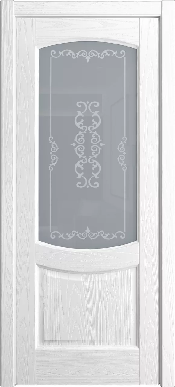 Дверь Эрнеста ДО имеет сборную конструкцию с фрезерованными филенками. Модель остеклена светлым или матовым стеклом с золотой фотопечатью или пескоструйным рисунком и покрыта натуральным шпоном ясеня или дуба на выбор.
