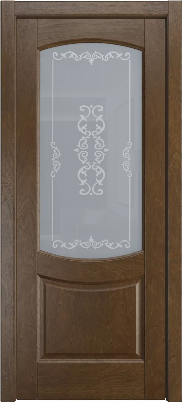 Дверь Эрнеста ДО имеет сборную конструкцию с фрезерованными филенками. Модель остеклена светлым или матовым стеклом с золотой фотопечатью или пескоструйным рисунком и покрыта натуральным шпоном ясеня или дуба на выбор.
