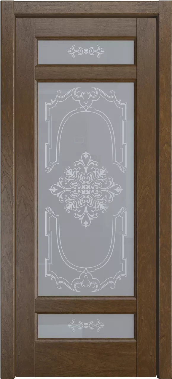 Дверь Клариса ДО имеет сборную конструкцию с фрезерованными филенками. Модель остеклена светлым или матовым стеклом с золотой фотопечатью или пескоструйным рисунком и покрыта натуральным шпоном ясеня или дуба на выбор.