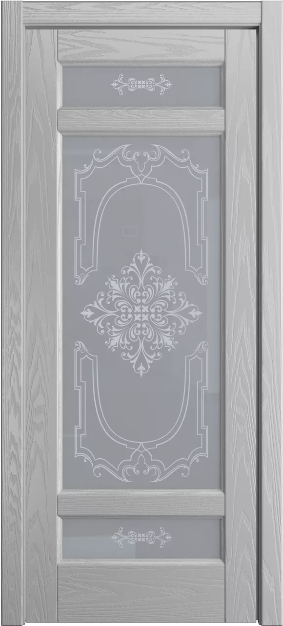 Дверь Клариса ДО имеет сборную конструкцию с фрезерованными филенками. Модель остеклена светлым или матовым стеклом с золотой фотопечатью или пескоструйным рисунком и покрыта натуральным шпоном ясеня или дуба на выбор.